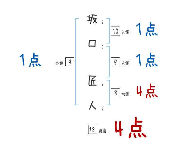 天運![]() | 坂口匠人さんの天運は10画の1つ星!不安を感じやすい傾向。ストレスを抱えないように注意しましょう。 家系が持つ宿命的な運勢を表します。祖先から受け継いだ苗字ですので自分の力が及びません。家柄を象徴します。 |