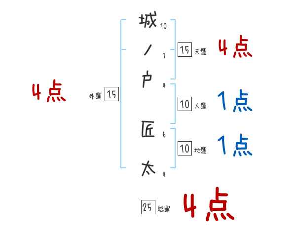 外運![]() | 城ノ戸匠太さんの外運は15画の4つ星!人徳があり出世する。順調に物事を進め円満な人生。 生活面を象徴する運勢です。外部から受ける影響力を表し、結婚運、家庭運や職場、環境への順応性を表します。 |
