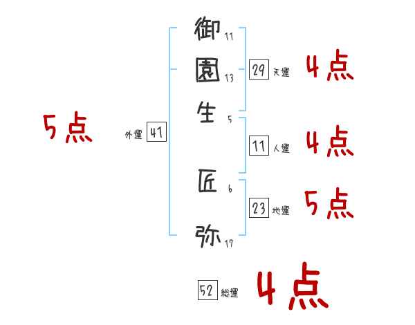 外運![]() | 御園生匠弥さんの外運は41画の5つ星!大志を抱き、目標に向かって実力を発揮し達成する。温和な性格。 生活面を象徴する運勢です。外部から受ける影響力を表し、結婚運、家庭運や職場、環境への順応性を表します。 |