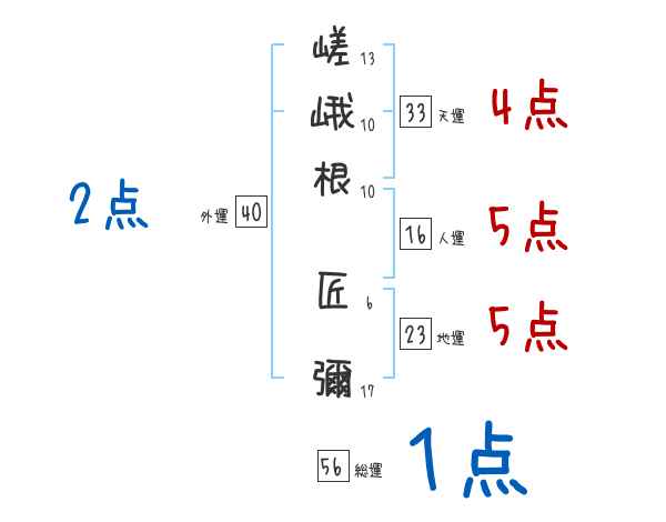 総運![]() | 嵯峨根匠彌さんの総運は56画の1つ星!消極的で無気力になりがち。誠実な気持ちが必要でしょう。 あなたの人生を表す1番重要な運勢です。生涯を通じて影響する総合運となり、主に50歳以降の晩年期に影響を及ぼします。 |