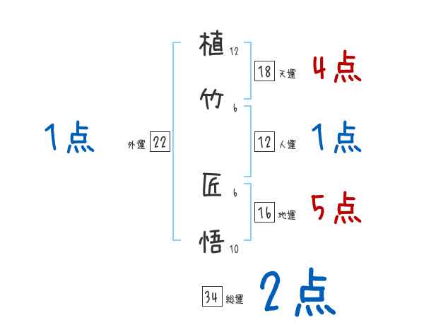 天運![]() | 植竹匠悟さんの天運は18画の4つ星!情熱的で剛気。忍耐力があり信頼される。 家系が持つ宿命的な運勢を表します。祖先から受け継いだ苗字ですので自分の力が及びません。家柄を象徴します。 |
