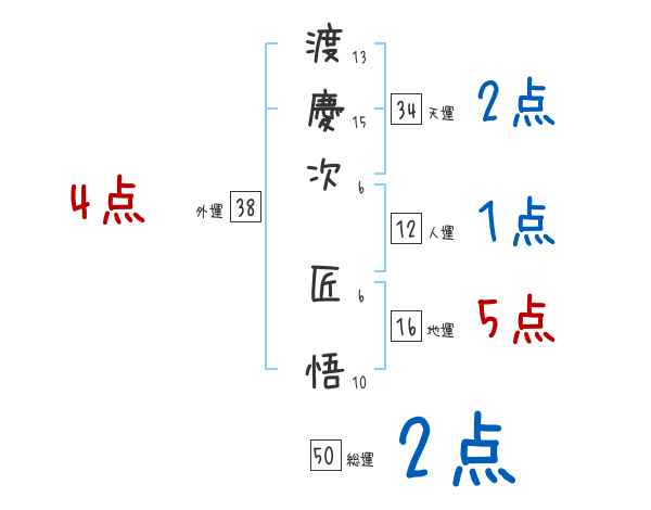 外運![]() | 渡慶次匠悟さんの外運は38画の4つ星!温厚な性格で技術的な才能を発揮する。職人的な仕事に向いている。 生活面を象徴する運勢です。外部から受ける影響力を表し、結婚運、家庭運や職場、環境への順応性を表します。 |