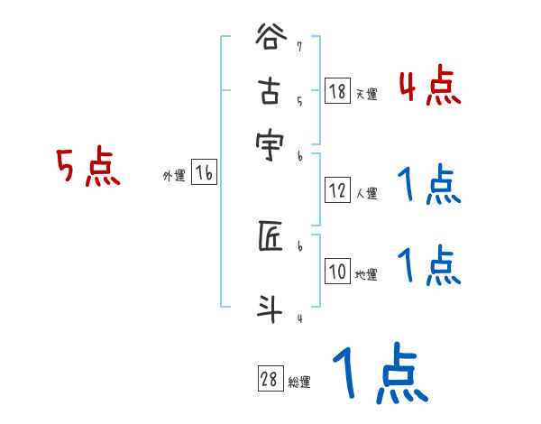 天運![]() | 谷古宇匠斗さんの天運は18画の4つ星!情熱的で剛気。忍耐力があり信頼される。 家系が持つ宿命的な運勢を表します。祖先から受け継いだ苗字ですので自分の力が及びません。家柄を象徴します。 |