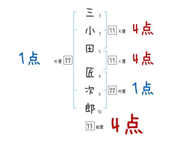 天運![]() | 三小田匠次郎さんの天運は11画の4つ星!着実に富や地位を得る幸運な人生。 家系が持つ宿命的な運勢を表します。祖先から受け継いだ苗字ですので自分の力が及びません。家柄を象徴します。 |