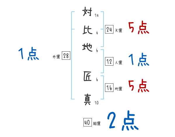 外運![]() | 対比地匠真さんの外運は28画の1つ星!家庭環境に注意。スポーツで活躍できる能力があるかも。 生活面を象徴する運勢です。外部から受ける影響力を表し、結婚運、家庭運や職場、環境への順応性を表します。 |