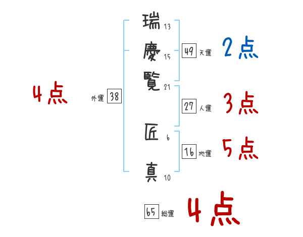 天運![]() | 瑞慶覧匠真さんの天運は49画の2つ星!不安定な性格で明暗がある人生。周りの人には支援されやすい。 家系が持つ宿命的な運勢を表します。祖先から受け継いだ苗字ですので自分の力が及びません。家柄を象徴します。 |