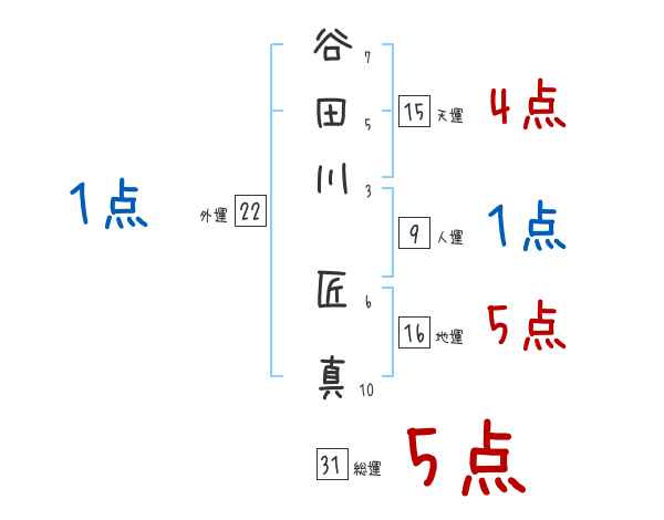 総運![]() | 谷田川匠真さんの総運は31画の5つ星!社交性があり判断力に優れる。順風満帆な人生で円満な生活。 あなたの人生を表す1番重要な運勢です。生涯を通じて影響する総合運となり、主に50歳以降の晩年期に影響を及ぼします。 |