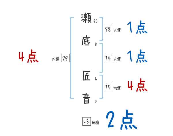天運![]() | 瀬底匠音さんの天運は28画の1つ星!家庭環境に注意。スポーツで活躍できる能力があるかも。 家系が持つ宿命的な運勢を表します。祖先から受け継いだ苗字ですので自分の力が及びません。家柄を象徴します。 |