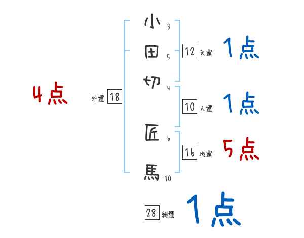 天運![]() | 小田切匠馬さんの天運は12画の1つ星!簡単な失敗で諦めてしまいやすいかも。着実に行動すると良いでしょう。 家系が持つ宿命的な運勢を表します。祖先から受け継いだ苗字ですので自分の力が及びません。家柄を象徴します。 |