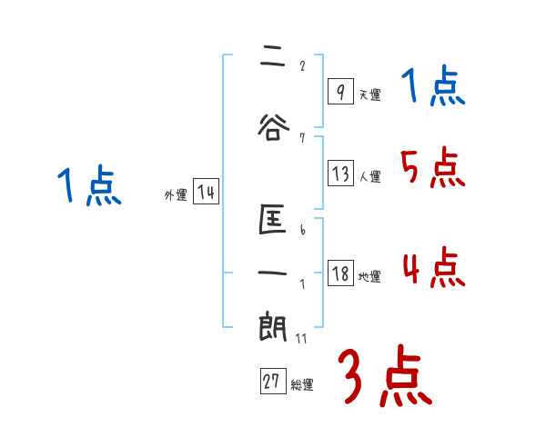 天運![]() | 二谷匡一朗さんの天運は9画の1つ星!消極的で才能を発揮することが苦手なことも。周りの意見に耳を傾けましょう。 家系が持つ宿命的な運勢を表します。祖先から受け継いだ苗字ですので自分の力が及びません。家柄を象徴します。 |