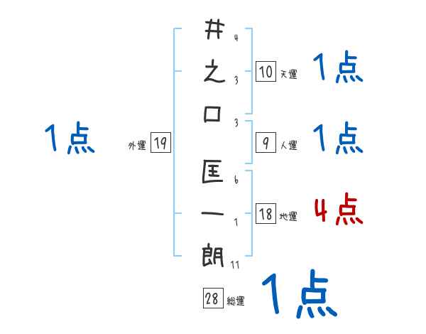 外運![]() | 井之口匡一朗さんの外運は19画の1つ星!優れた才能を持ちますが、協調性が足りないことも。周りの人と協力する事を意識しましょう。 生活面を象徴する運勢です。外部から受ける影響力を表し、結婚運、家庭運や職場、環境への順応性を表します。 |