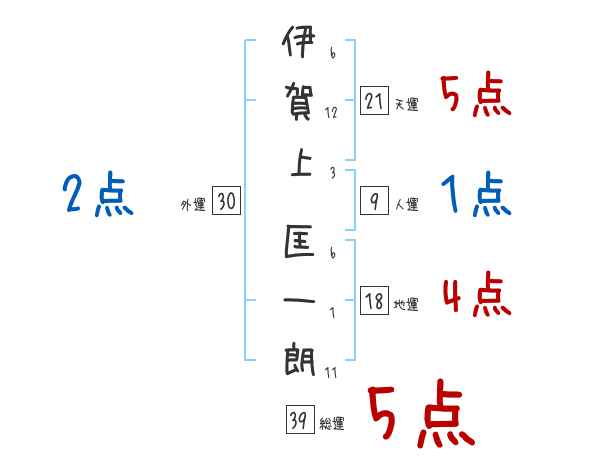 総運![]() | 伊賀上匡一朗さんの総運は39画の5つ星!社交性に優れ人望が厚い。人の上に立ち成功する。 あなたの人生を表す1番重要な運勢です。生涯を通じて影響する総合運となり、主に50歳以降の晩年期に影響を及ぼします。 |