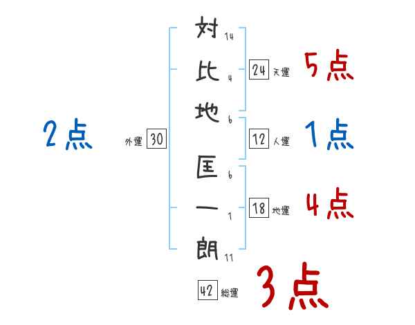 外運![]() | 対比地匡一朗さんの外運は30画の2つ星!浮き沈みの激しさに注意しましょう。 生活面を象徴する運勢です。外部から受ける影響力を表し、結婚運、家庭運や職場、環境への順応性を表します。 |
