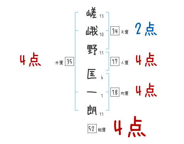 外運![]() | 嵯峨野匡一朗さんの外運は35画の4つ星!温厚な性格で感受性が高い。穏和な性格で人望が厚い。 生活面を象徴する運勢です。外部から受ける影響力を表し、結婚運、家庭運や職場、環境への順応性を表します。 |