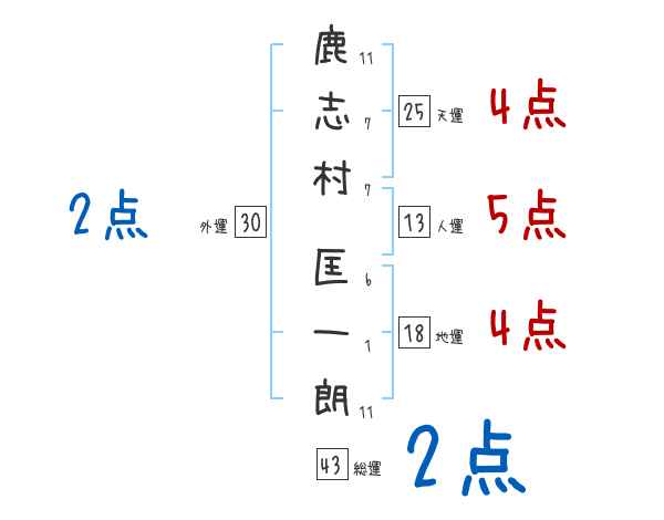 人運![]() | 鹿志村匡一朗さんの人運は13画の5つ星!才能に恵まれ人気がある。名声を手に入れる。円満な人生。 性格や才能などを表す2番目に重要な運勢です。人間関係や協調性、社会的な成功に影響します。主に20歳から50歳ぐらいまでの中年期の運勢を表します。 |