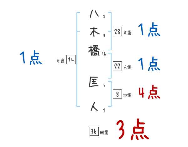 | 人運  | 八木橋匡人さんの人運は22画の1つ星!努力することが苦手ないっぽう手先が器用。芸術性にも優れる。性格や才能などを表す2番目に重要な運勢です。人間関係や協調性、社会的な成功に影響します。主に20歳から50歳ぐらいまでの中年期の運勢を表します。 |