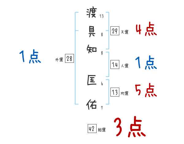天運![]() | 渡具知匡佑さんの天運は29画の4つ星!完全主義で才能がある。厳格な心の持ち主。 家系が持つ宿命的な運勢を表します。祖先から受け継いだ苗字ですので自分の力が及びません。家柄を象徴します。 |