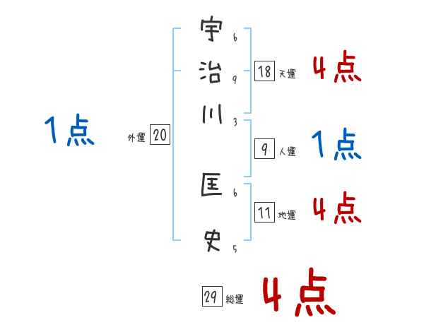 天運![]() | 宇治川匡史さんの天運は18画の4つ星!情熱的で剛気。忍耐力があり信頼される。 家系が持つ宿命的な運勢を表します。祖先から受け継いだ苗字ですので自分の力が及びません。家柄を象徴します。 |