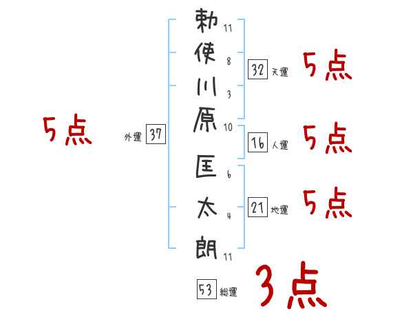 天運![]() | 勅使川原匡太朗さんの天運は32画の5つ星!柔軟性があり成功する。チャンスが多く金運が良い。 家系が持つ宿命的な運勢を表します。祖先から受け継いだ苗字ですので自分の力が及びません。家柄を象徴します。 |