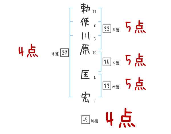 天運![]() | 勅使川原匡宏さんの天運は32画の5つ星!柔軟性があり成功する。チャンスが多く金運が良い。 家系が持つ宿命的な運勢を表します。祖先から受け継いだ苗字ですので自分の力が及びません。家柄を象徴します。 |