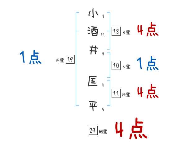 外運![]() | 小酒井匡平さんの外運は19画の1つ星!優れた才能を持ちますが、協調性が足りないことも。周りの人と協力する事を意識しましょう。 生活面を象徴する運勢です。外部から受ける影響力を表し、結婚運、家庭運や職場、環境への順応性を表します。 |