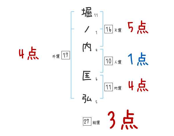 外運![]() | 堀ノ内匡弘さんの外運は17画の4つ星!積極的な行動力。地位を気づき財産を手に入れる。純粋な心と直感力。 生活面を象徴する運勢です。外部から受ける影響力を表し、結婚運、家庭運や職場、環境への順応性を表します。 |