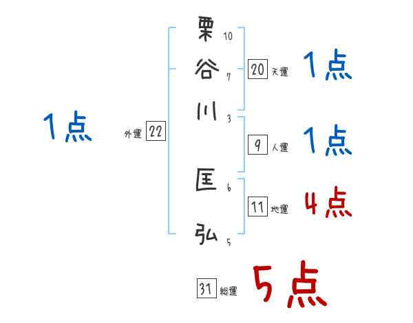 外運![]() | 栗谷川匡弘さんの外運は22画の1つ星!努力することが苦手ないっぽう手先が器用。芸術性にも優れる。 生活面を象徴する運勢です。外部から受ける影響力を表し、結婚運、家庭運や職場、環境への順応性を表します。 |
