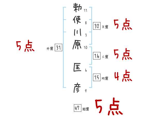 天運![]() | 勅使川原匡彦さんの天運は32画の5つ星!柔軟性があり成功する。チャンスが多く金運が良い。 家系が持つ宿命的な運勢を表します。祖先から受け継いだ苗字ですので自分の力が及びません。家柄を象徴します。 |