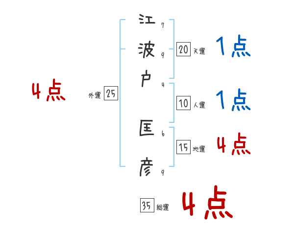 地運![]() | 江波戸匡彦さんの地運は15画の4つ星!人徳があり出世する。順調に物事を進め円満な人生。 個性を表す基礎的な運勢です。性格形成や対人関係、行動力など家庭環境に影響されます。主に誕生してから20歳くらいまでの若年期の運勢を表します。 |