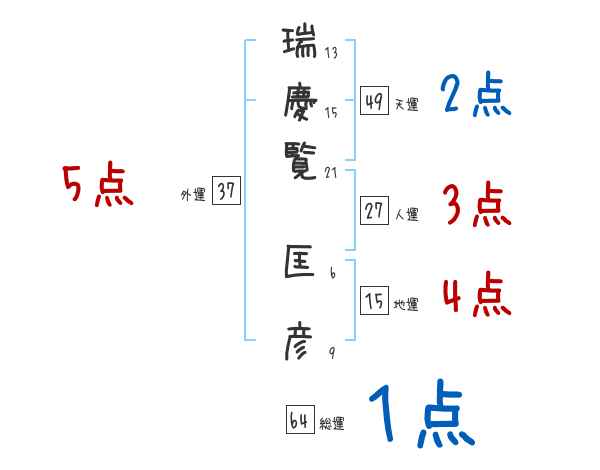 天運![]() | 瑞慶覧匡彦さんの天運は49画の2つ星!不安定な性格で明暗がある人生。周りの人には支援されやすい。 家系が持つ宿命的な運勢を表します。祖先から受け継いだ苗字ですので自分の力が及びません。家柄を象徴します。 |