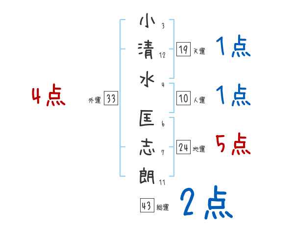 外運![]() | 小清水匡志朗さんの外運は33画の4つ星!権力志向でプライドが高い。勇気があり運を切り開き成功する。 生活面を象徴する運勢です。外部から受ける影響力を表し、結婚運、家庭運や職場、環境への順応性を表します。 |