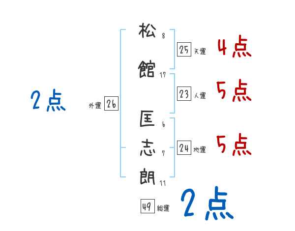 天運![]() | 松館匡志朗さんの天運は25画の4つ星!個性があり才能があふれる。強運の持ち主で発展する。 家系が持つ宿命的な運勢を表します。祖先から受け継いだ苗字ですので自分の力が及びません。家柄を象徴します。 |
