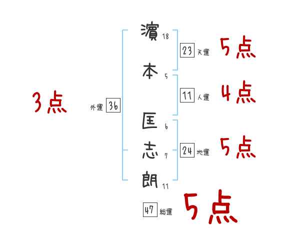 外運![]() | 濵本匡志朗さんの外運は36画の3つ星!先見性が豊かです。多少神経質で苦労することも。 生活面を象徴する運勢です。外部から受ける影響力を表し、結婚運、家庭運や職場、環境への順応性を表します。 |