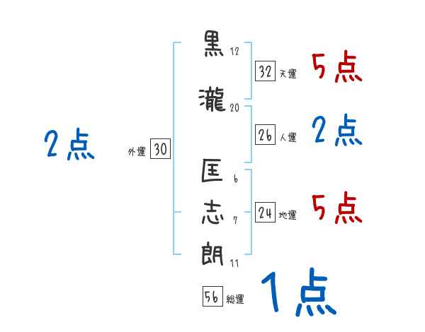 天運![]() | 黒瀧匡志朗さんの天運は32画の5つ星!柔軟性があり成功する。チャンスが多く金運が良い。 家系が持つ宿命的な運勢を表します。祖先から受け継いだ苗字ですので自分の力が及びません。家柄を象徴します。 |