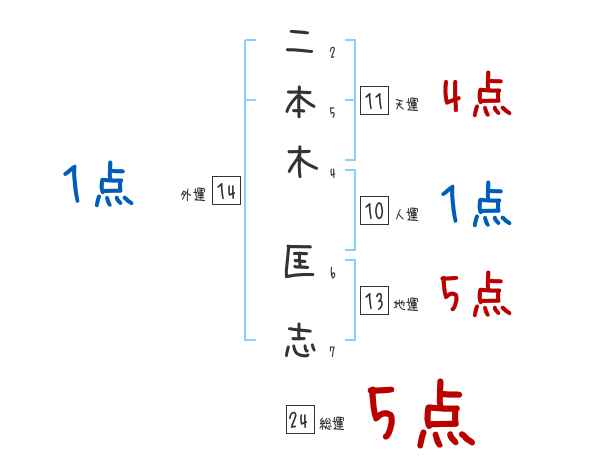 人運![]() | 二本木匡志さんの人運は10画の1つ星!不安を感じやすい傾向。ストレスを抱えないように注意しましょう。 性格や才能などを表す2番目に重要な運勢です。人間関係や協調性、社会的な成功に影響します。主に20歳から50歳ぐらいまでの中年期の運勢を表します。 |