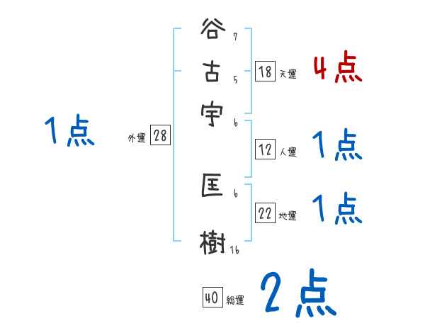 外運![]() | 谷古宇匡樹さんの外運は28画の1つ星!家庭環境に注意。スポーツで活躍できる能力があるかも。 生活面を象徴する運勢です。外部から受ける影響力を表し、結婚運、家庭運や職場、環境への順応性を表します。 |