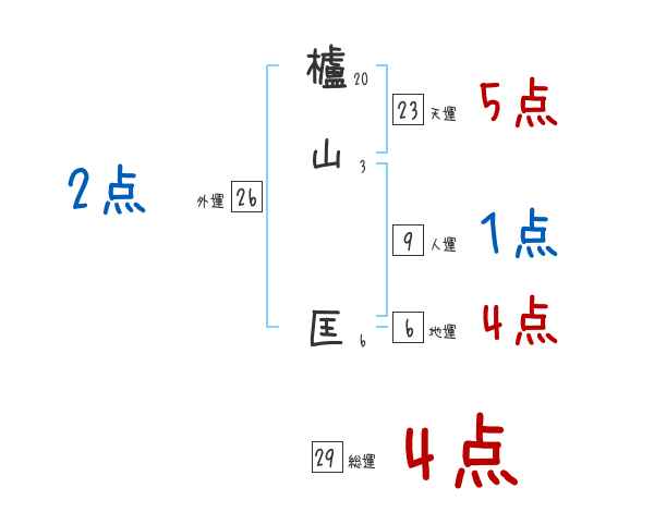 外運![]() | 櫨山匡さんの外運は26画の2つ星!波瀾万丈かも。信頼できる人を大事にしましょう。 生活面を象徴する運勢です。外部から受ける影響力を表し、結婚運、家庭運や職場、環境への順応性を表します。 |