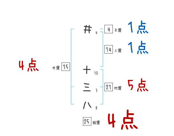 天運![]() | 井十三八さんの天運は4画の1つ星!感情が不安定で苦労するかも。周囲との協調を心掛けましょう。 家系が持つ宿命的な運勢を表します。祖先から受け継いだ苗字ですので自分の力が及びません。家柄を象徴します。 |