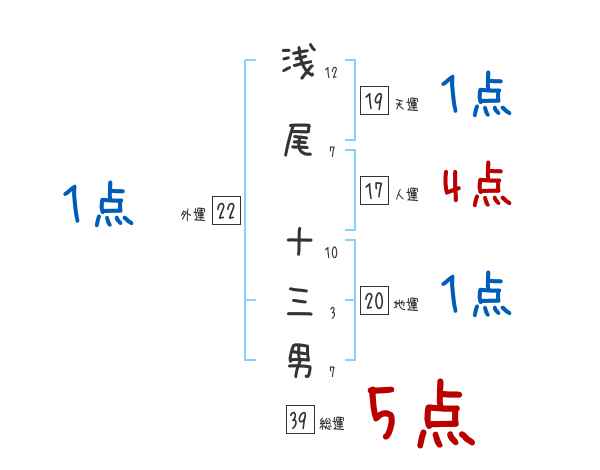 外運![]() | 浅尾十三男さんの外運は22画の1つ星!努力することが苦手ないっぽう手先が器用。芸術性にも優れる。 生活面を象徴する運勢です。外部から受ける影響力を表し、結婚運、家庭運や職場、環境への順応性を表します。 |