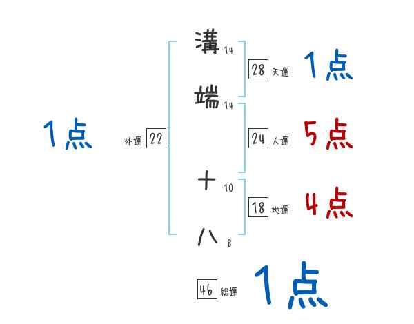 天運![]() | 溝端十八さんの天運は28画の1つ星!家庭環境に注意。スポーツで活躍できる能力があるかも。 家系が持つ宿命的な運勢を表します。祖先から受け継いだ苗字ですので自分の力が及びません。家柄を象徴します。 |