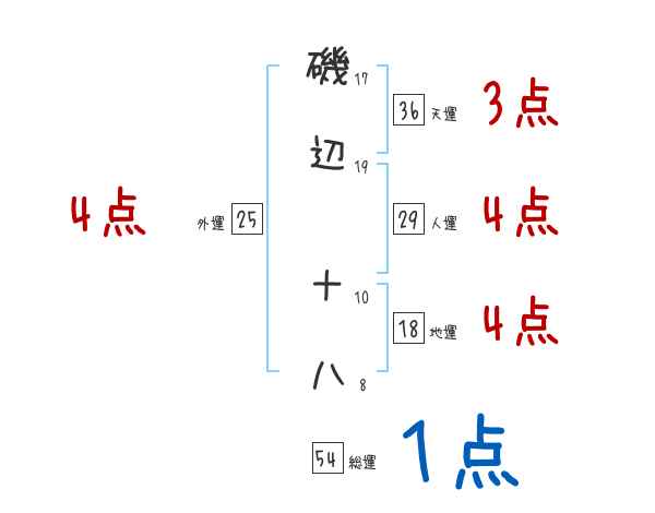 天運![]() | 磯辺十八さんの天運は36画の3つ星!先見性が豊かです。多少神経質で苦労することも。 家系が持つ宿命的な運勢を表します。祖先から受け継いだ苗字ですので自分の力が及びません。家柄を象徴します。 |