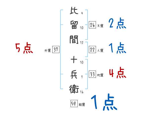 外運![]() | 比留間十兵衛さんの外運は37画の5つ星!努力家で順応性に優れる。現実的な考え方ができ忠実に物事をこなす。 生活面を象徴する運勢です。外部から受ける影響力を表し、結婚運、家庭運や職場、環境への順応性を表します。 |