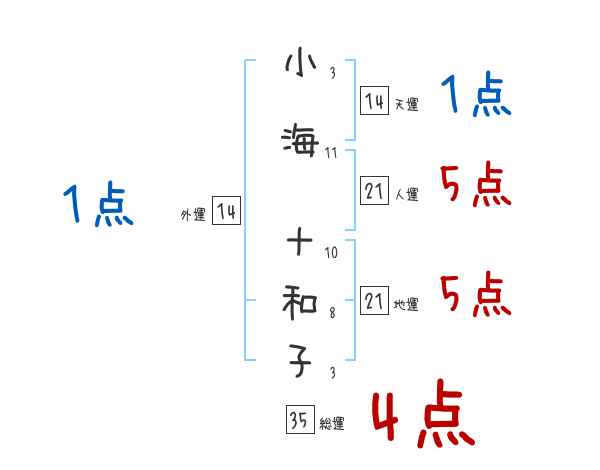 外運![]() | 小海十和子さんの外運は14画の1つ星!人に対して優しいがストレスを溜め込みがち。人間関係のトラブルを避けるよう気をつけましょう。 生活面を象徴する運勢です。外部から受ける影響力を表し、結婚運、家庭運や職場、環境への順応性を表します。 |