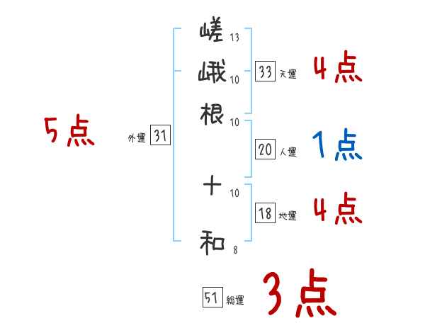 総運![]() | 嵯峨根十和さんの総運は51画の3つ星!変化が激しく、危険に注意。堅実な性格。 あなたの人生を表す1番重要な運勢です。生涯を通じて影響する総合運となり、主に50歳以降の晩年期に影響を及ぼします。 |