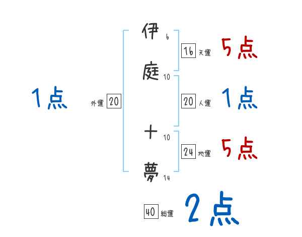 天運![]() | 伊庭十夢さんの天運は16画の5つ星!人望が厚く大きく発展する。逆転成功が見える。 家系が持つ宿命的な運勢を表します。祖先から受け継いだ苗字ですので自分の力が及びません。家柄を象徴します。 |