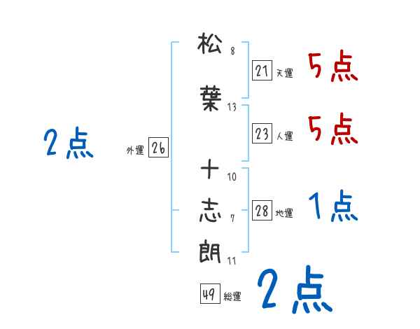 天運![]() | 松葉十志朗さんの天運は21画の5つ星!統率力がある。独立し成功する。名誉を手に入れる。 家系が持つ宿命的な運勢を表します。祖先から受け継いだ苗字ですので自分の力が及びません。家柄を象徴します。 |