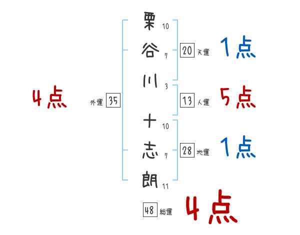外運![]() | 栗谷川十志朗さんの外運は35画の4つ星!温厚な性格で感受性が高い。穏和な性格で人望が厚い。 生活面を象徴する運勢です。外部から受ける影響力を表し、結婚運、家庭運や職場、環境への順応性を表します。 |