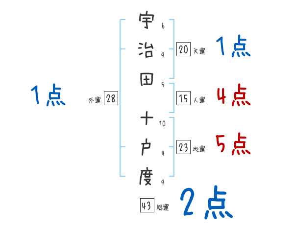 外運![]() | 宇治田十戸度さんの外運は28画の1つ星!家庭環境に注意。スポーツで活躍できる能力があるかも。 生活面を象徴する運勢です。外部から受ける影響力を表し、結婚運、家庭運や職場、環境への順応性を表します。 |
