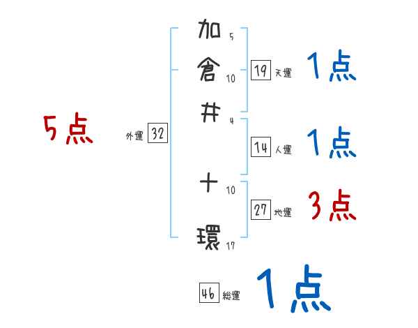 外運![]() | 加倉井十環さんの外運は32画の5つ星!柔軟性があり成功する。チャンスが多く金運が良い。 生活面を象徴する運勢です。外部から受ける影響力を表し、結婚運、家庭運や職場、環境への順応性を表します。 |