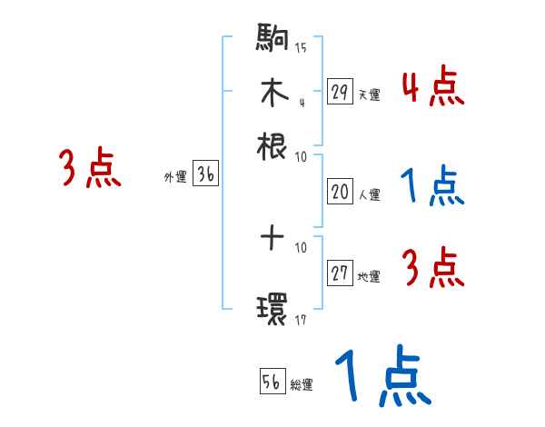 外運![]() | 駒木根十環さんの外運は36画の3つ星!先見性が豊かです。多少神経質で苦労することも。 生活面を象徴する運勢です。外部から受ける影響力を表し、結婚運、家庭運や職場、環境への順応性を表します。 |
